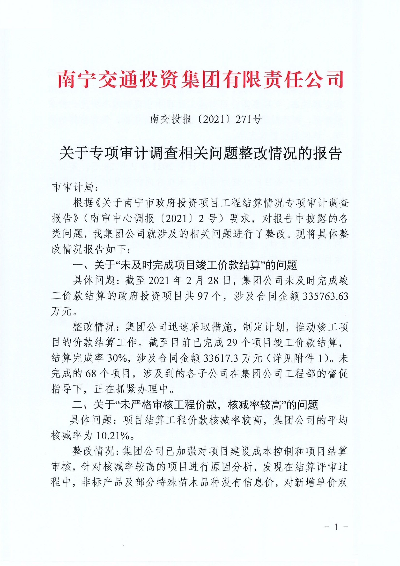 2020年度審計(jì)項(xiàng)目發(fā)現(xiàn)問(wèn)題整改公開(kāi)-南寧市政府投資項(xiàng)目工程結(jié)算情況專(zhuān)項(xiàng)審計(jì)調(diào)查