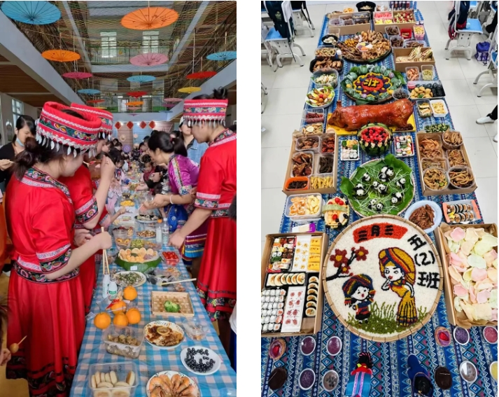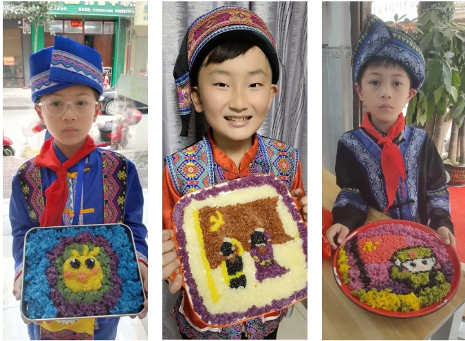 “長(zhǎng)桌宴”又稱合攏宴,是侗族、苗族、瑤族等多個(gè)民族的風(fēng)俗習(xí)慣,常用于接親嫁女、滿月酒、村寨聯(lián)誼等宴飲活動(dòng),代表最為隆重的待客禮俗,已有幾千年歷史。“長(zhǎng)桌宴”上有壯族特色的五色糯米飯、艾葉糍粑、壯粽,苗族的傳統(tǒng)佳肴,還有黎族的三色飯……一份份美食造型美觀、色彩鮮艷、香味撲鼻。圖為集團(tuán)職工拍攝的孩子參加學(xué)?!叭氯被顒?dòng)。