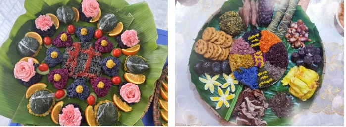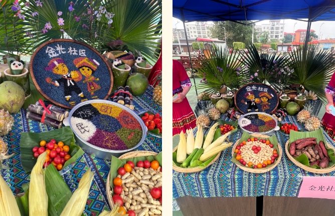 大家用簸箕拼盤將層次分明、色彩斑斕的各項珍饈有規(guī)律的擺放到簸箕中,從五谷雜糧的馥郁到山珍海味的鮮美,再到田園時蔬的清香,這些菜肴不僅口感獨特,而且蘊含著豐富的民族文化內涵,體現(xiàn)了人們對美好生活的向往和追求。圖為集團公司職工前往社區(qū)參加活動拍攝的特色美食照片。